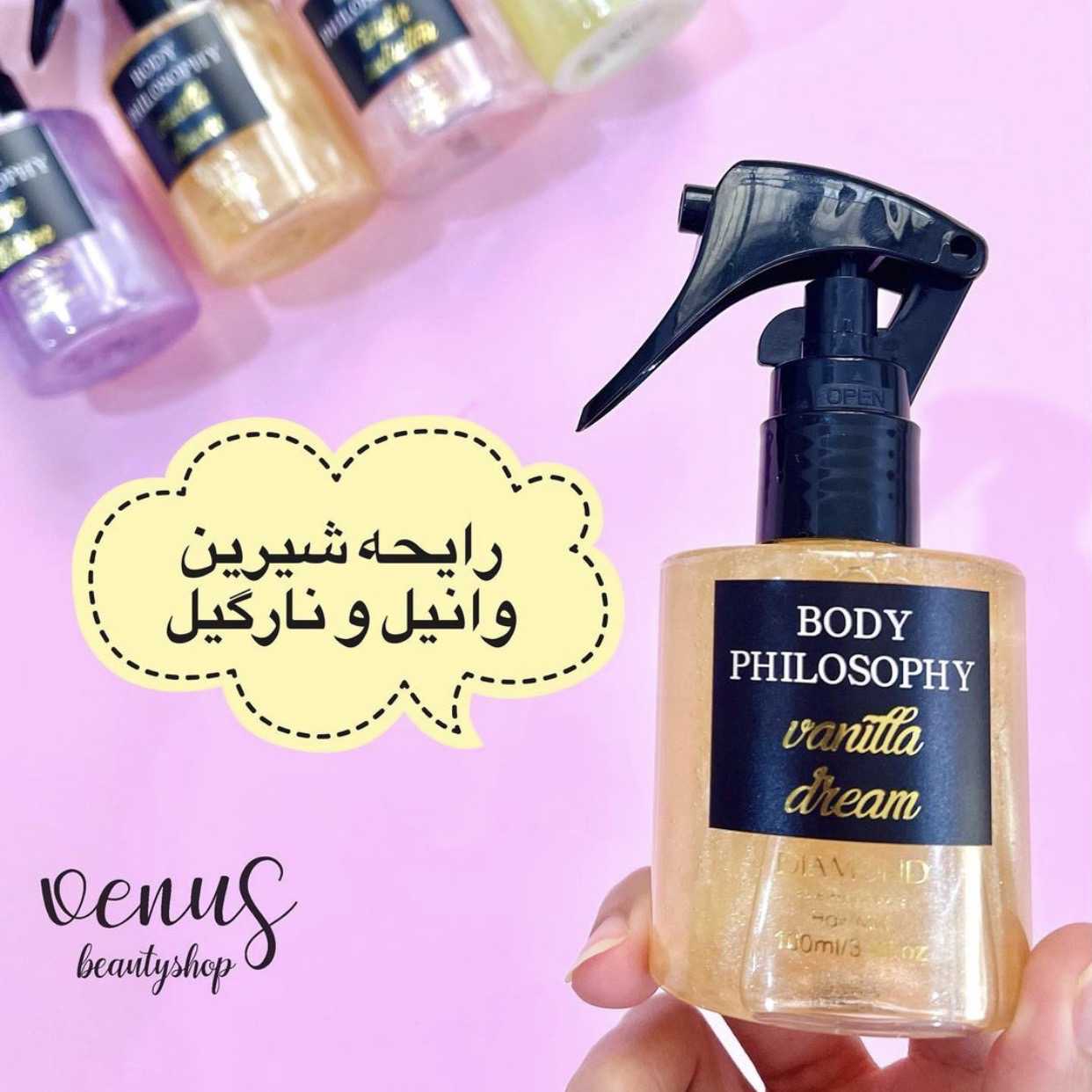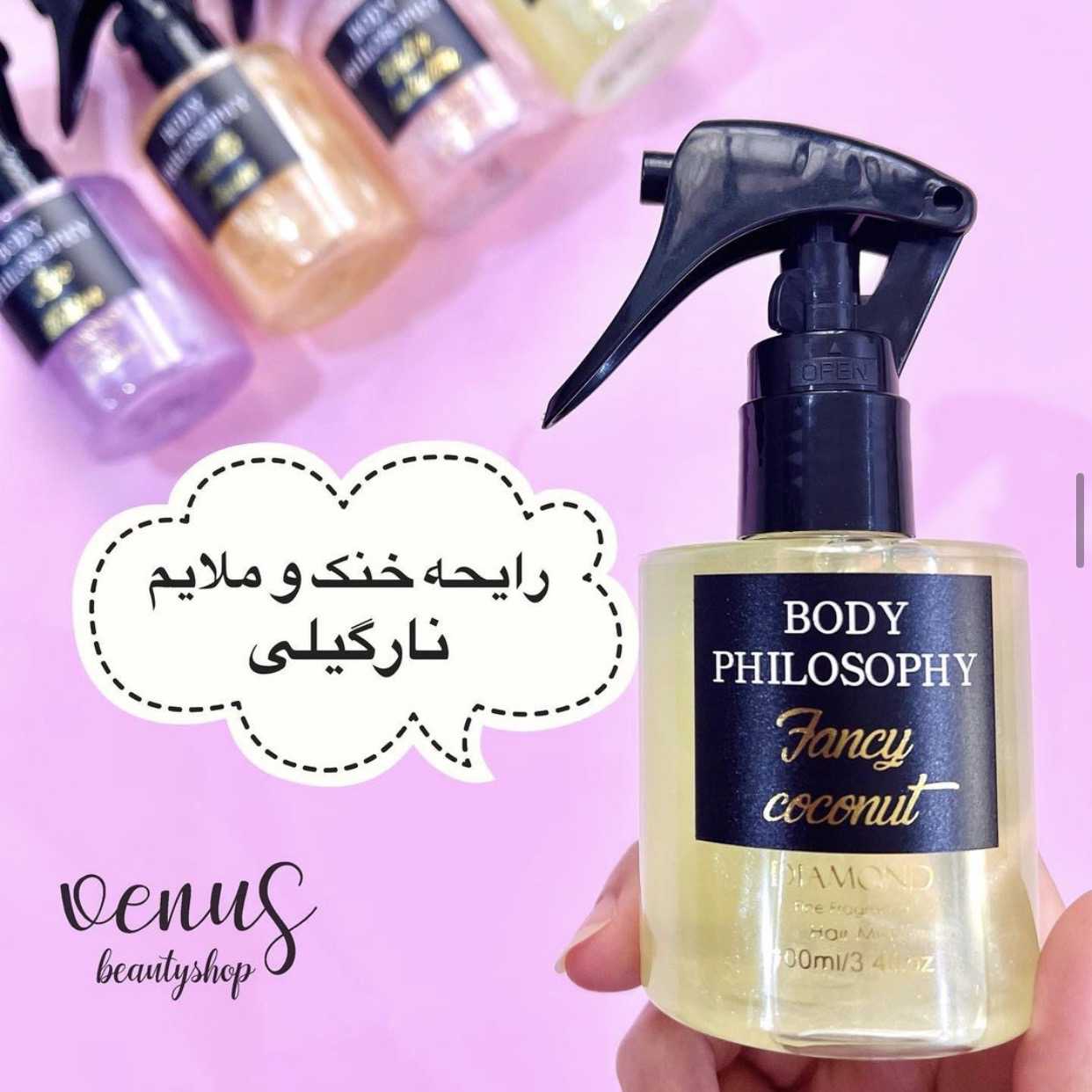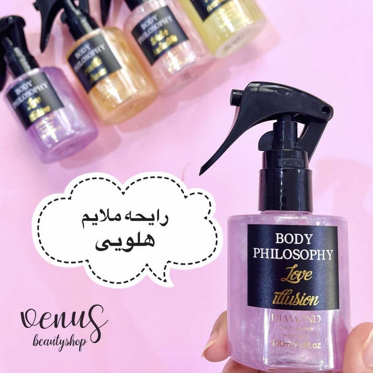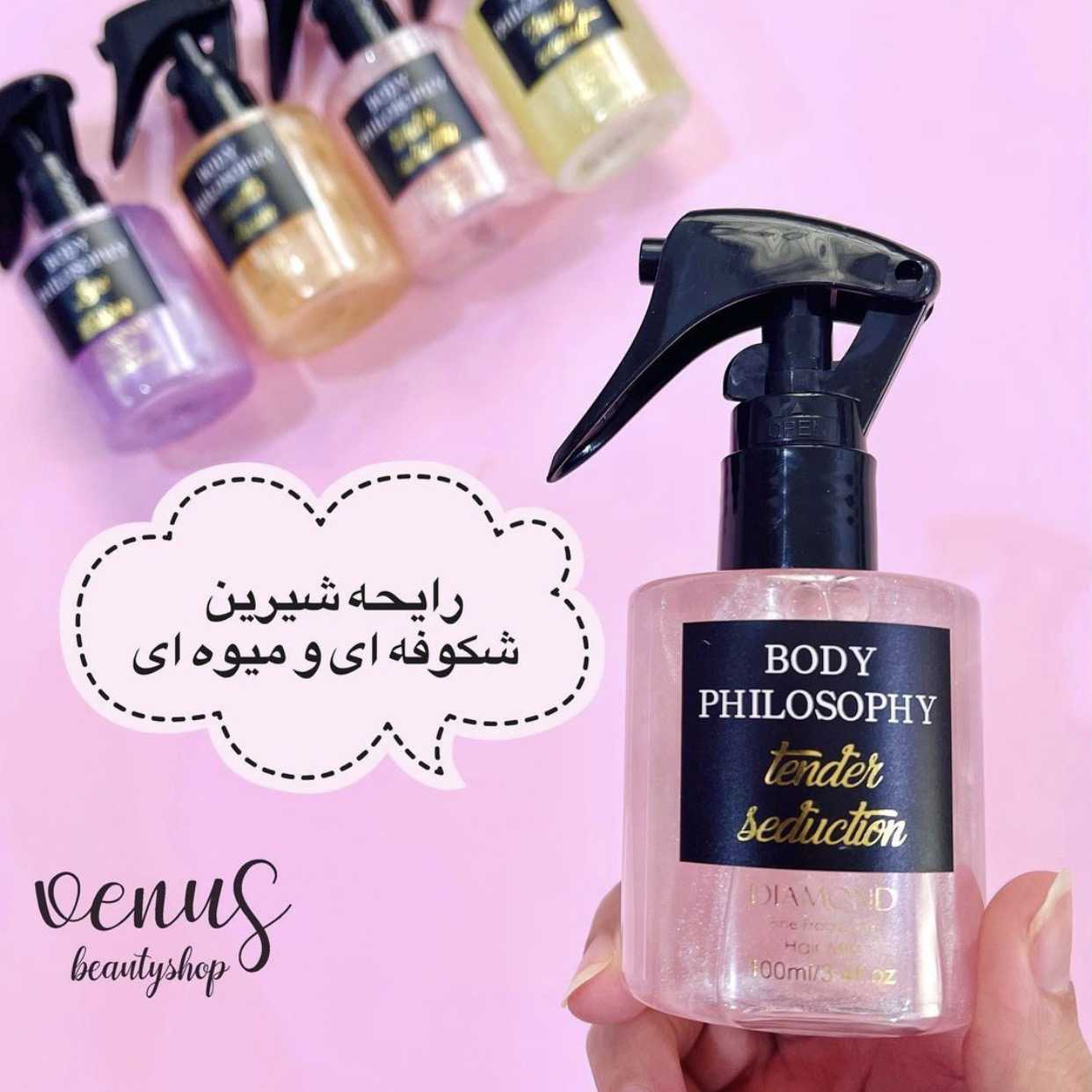 عطر مو که به آن میست مو نیز گفته می شود نوعی عطر است که به طور خاص برای موهای شما طراحی شده است. معمولاً رایحه شامپو و دیگر محصولات مو ماندگاری بالایی ندارند و بعد از چند ساعت از بین میروند، از این رو برای اینکه موهای خوشبو داشته باشیم بهتر است از عطر مو استفاده کنیم. علاوه بر این از آنجایی که مو قسمتی از بدن است که گرمای بیشتری دارد، رایحه عطر را بیشتر از بقیه قسمتها پخش میکند.عطر موهای شاینی body philosophy دارای شاین ریز هستن و حالت براق و شاینی به موهای شما میدهد .همچنین این عطرموها باعث میشوند تا با حرکت دادن موهای خود، رایحه ای دلپذیر را در هوا پخش کنید و اطرافیانتان از بودن کنار شما لذت ببرند.